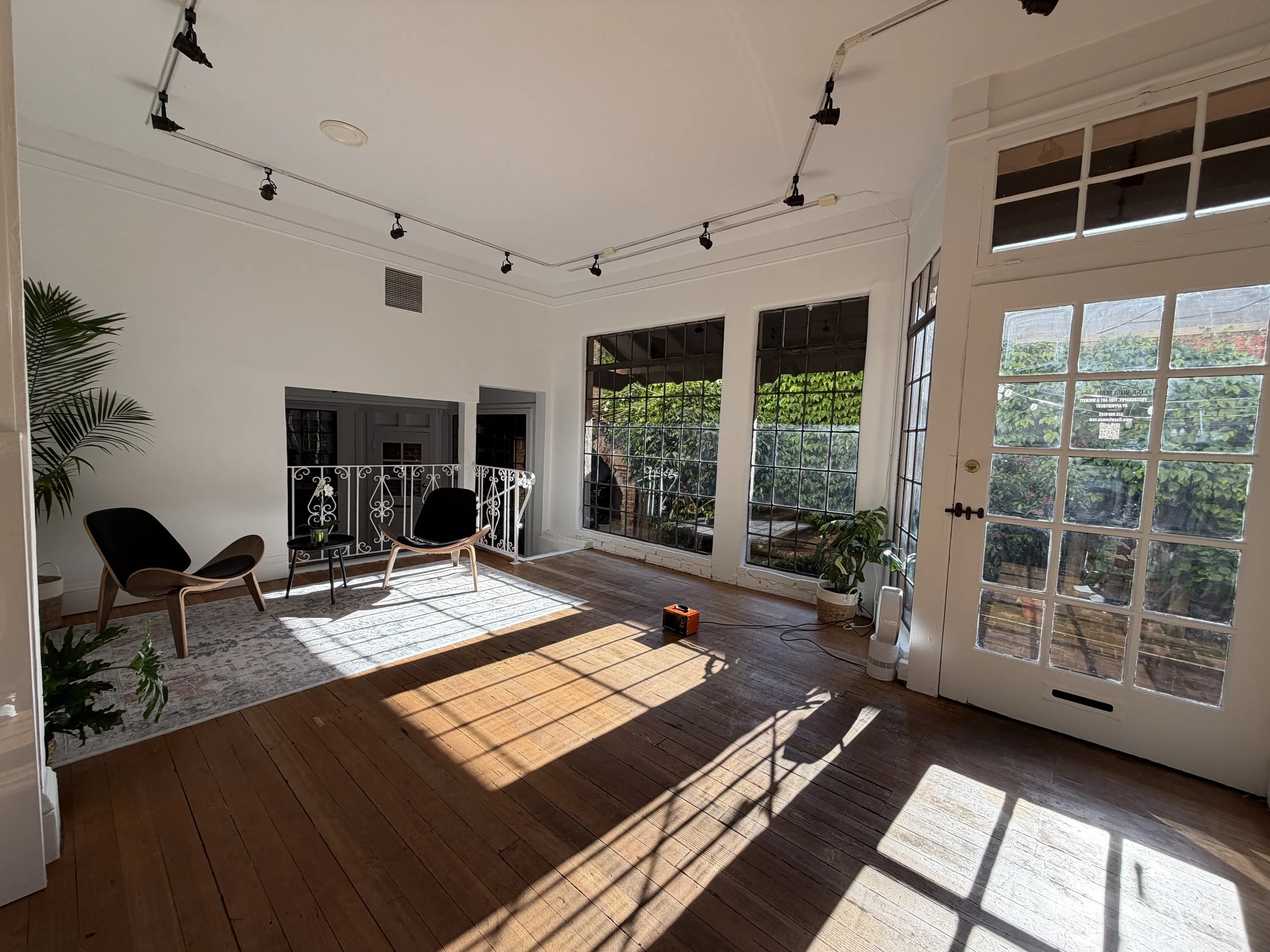 The Studio’s architecture remains charming and unusual. It combines multiple original spaces into a single large unit which has an expansive large wall, banks of divided-lite leaded windows which let in expansive afternoon sun, and has three entries, two directly into the charming El Paseo walkway, and one entry onto the main street. The Studio functions as a gallery and also as a creative space where I shoot and paint.